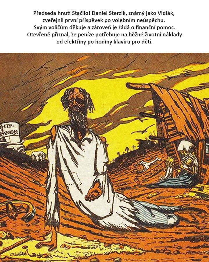Předseda hnutí Stačilo! Daniel Sterzik, známý jako Vidlák, zveřejnil první příspěvek po volebním neúspěchu. Svým voličům děkuje a zároveň je žádá o finanční pomoc. Otevřeně přiznal, že peníze potřebuje na běžné životní náklady – od elektřiny po hodiny klavíru pro děti.